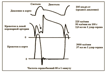 События, происходящие в человеческом сердце, вероятнее всего, аналогичны, полученным в эксперименте. Бóльшая часть крови попадает из аорты в русло коронарных артерий, несомненно, во время диастолы. Это естественно, потому что в это время давление в желудочке, а следовательно, и интрамуральное в его стенке значительно ниже давления в аорте. Максимальная скорость объёмного коронарного кровотока попадает на момент закрытия полулунных клапанов. Второй по величине пик объёмного кровотока совпадает с начальным периодом сердечного выброса, когда давление в аорте достигает своего пика и, вероятно, создаёт достаточный градиент давления для проталкивания крови в коронарные сосуды. На кривой имеется и третий зубец, наименьший, попадающий на конец систолы, предшествующий закрытию полулунных клапанов (отмечен стрелкой). Его гемодинамическая значимость мизерна, однако он может оказаться полезным для понимания событий в аорте в данный период. Попытка растолковать его происхождение будет сделана в другом разделе.